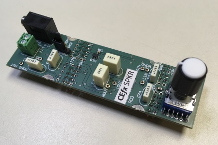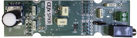 For the mono speaker output, the stereo signals go to summing amp U20A, a standard design, and then into speaker driver U18. The SSM2305 is a well-behaved power amplifier that has the required shutdown mode. When used in a desktop/experimental situation with a speaker nearby, a couple of watts of power is sufficient. It can fill a classroom when driving an efficient 4-Ohm speaker. Although the SSM2305 works fine with a single-ended input, since there was a spare op-amp (U20B) it was used to invert the summed mono signal and create a differential input for the SSM2305. It probably doesn't improve anything, but it just makes us feel better.